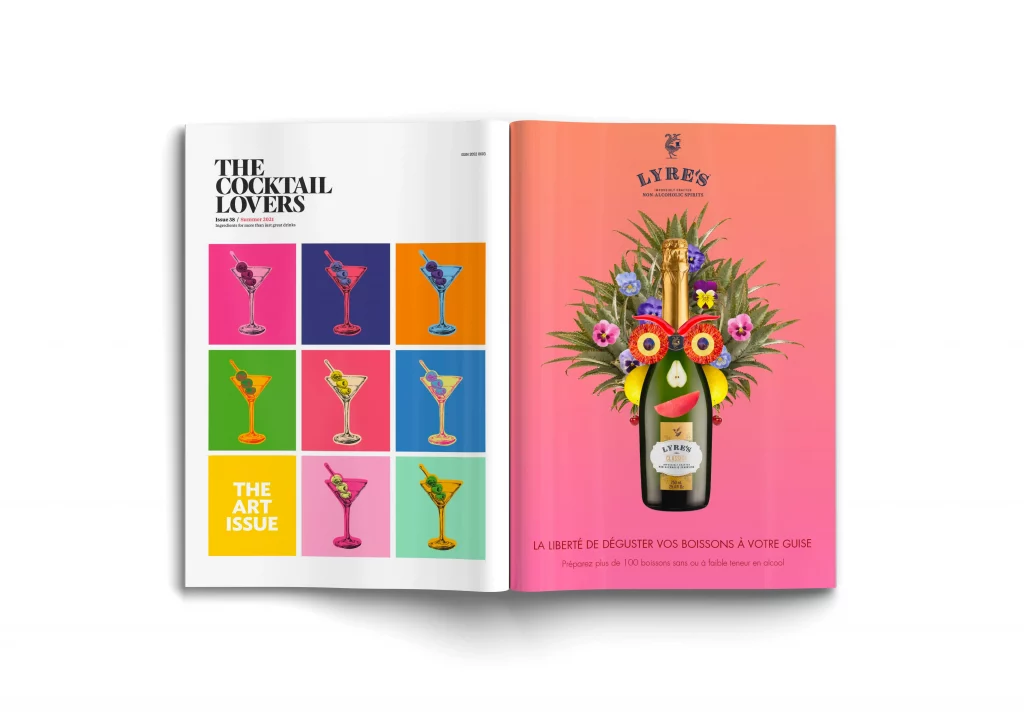 Cette publicité pour Lyre’s présente un design festif avec une bouteille ornée d’un «visage» en fruits, entourée de feuilles tropicales et de fleurs pour une ambiance exotique et ludique. Le fond dégradé rose-orange chaud complète le texte rouge audacieux, «La liberté de déguster vos boissons à votre guise», assorti à la couleur des cerises.